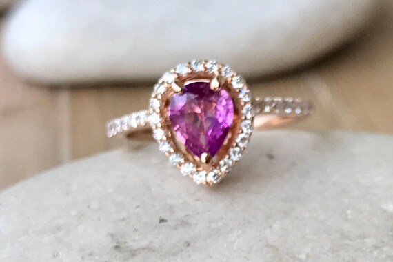 Pink Sapphire Pear Engagement Ring Rose Gold Halo Engagement Ring 1 Carat Teardrop Sapphire Ring Pink Promise Ring Pink Anniversary Ring
